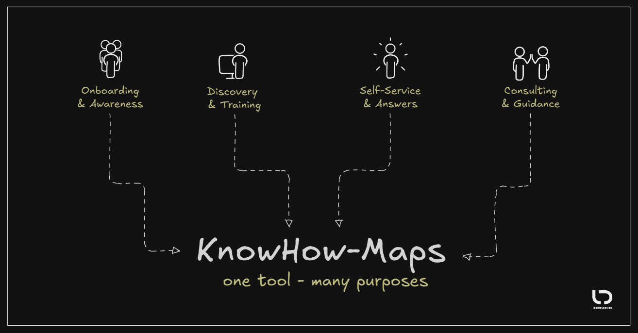 Unsere KnowHow-Maps sind deshalb gleichzeitig Onboardingtools, Nachschlagewerke, Beratungswerkzeuge, Schulungsgrundlagen, Kommunikationsmittel und zentrale "Sammelstellen" für alle verifizierten Informationen und Ressourcen zu einem bestimmten Thema. Auf - gefühlt - einer Seite.
